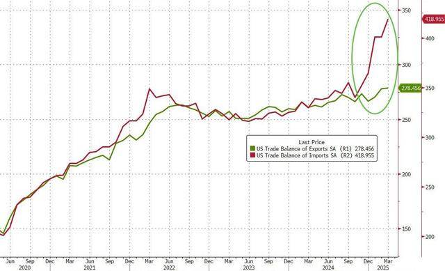 周二发布的数据显示,美国3月份包罗商品和办事正在内的国际商业逆差环比增加14%,具体来看,进口额跃升4。4%,达到创记载的4190亿美元,而出口仅小幅增加0。2%,至2784。6亿美元。消费品进口创汗青新高,次要是药品进口量大幅添加。同时,本钱设备和灵活车的进口量也有所上升。
